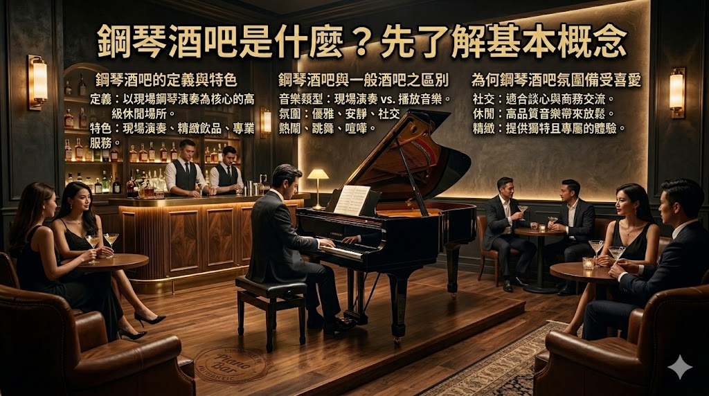 A:鋼琴酒吧是以現場鋼琴演奏為主題的酒吧,提供音樂、飲品與高質感氛圍,常見於情侶約會、商務聚會與休閒放鬆場所