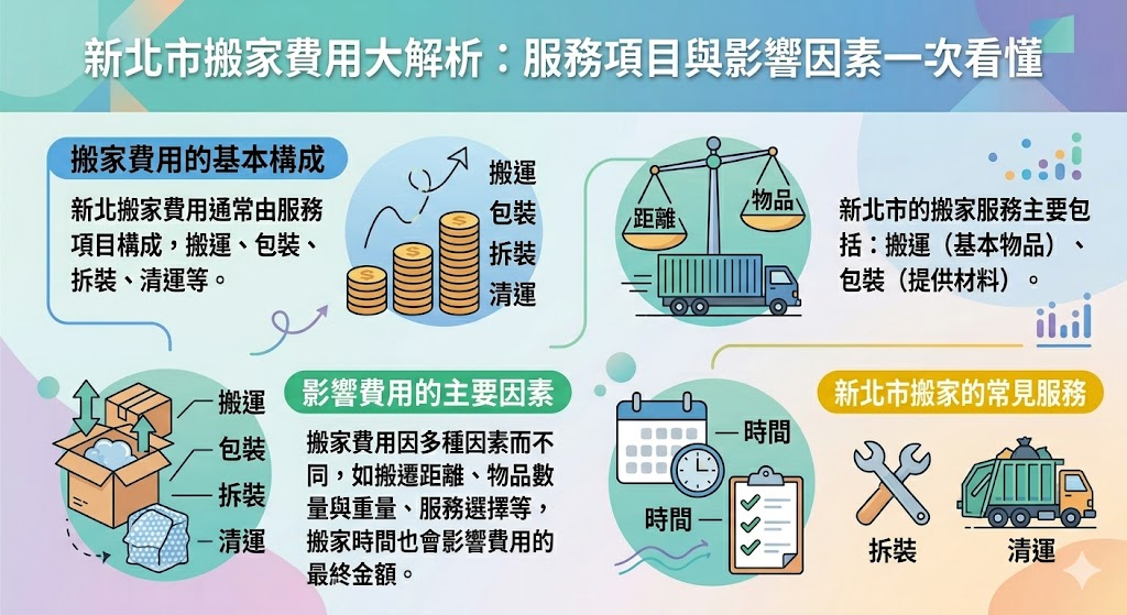 新北搬家費用主要由服務項目構成,包含基本的搬運、防護包裝、家具拆裝及廢棄物清運。費用會根據所選的服務範圍、物品數量及特殊需求進行調整。