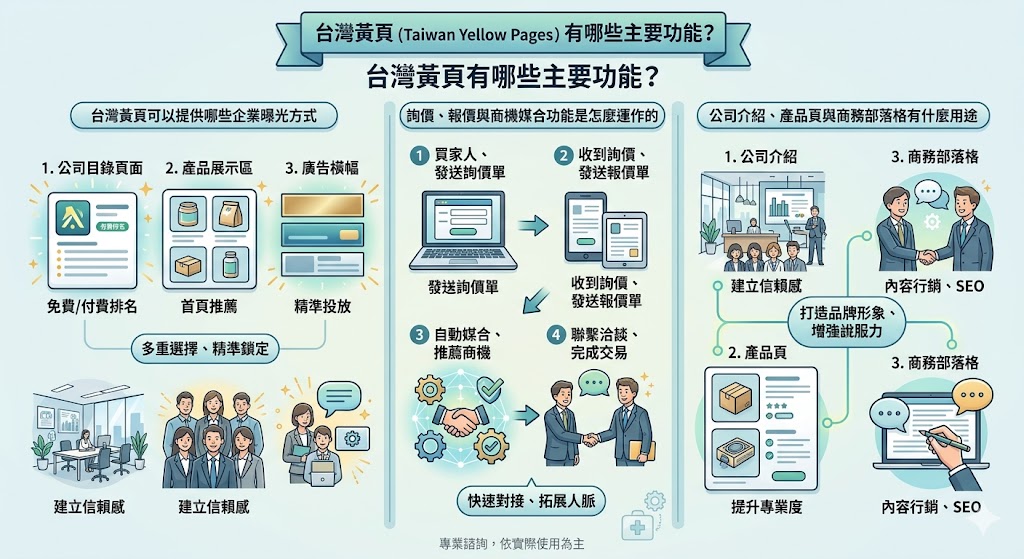 現在很多人提到「台灣黃頁」,已經不是只想到早期的工商電話簿,而是指一類結合企業名錄、產品刊登、詢價報價與商務曝光的數位平台。以台灣常見平台來看,像台灣黃頁詢價平台主打中小企業廣告刊登、詢價/報價與 B2B 商機媒合;中華黃頁則從傳統黃頁延伸到數位曝光、企業架站與整合行銷服務