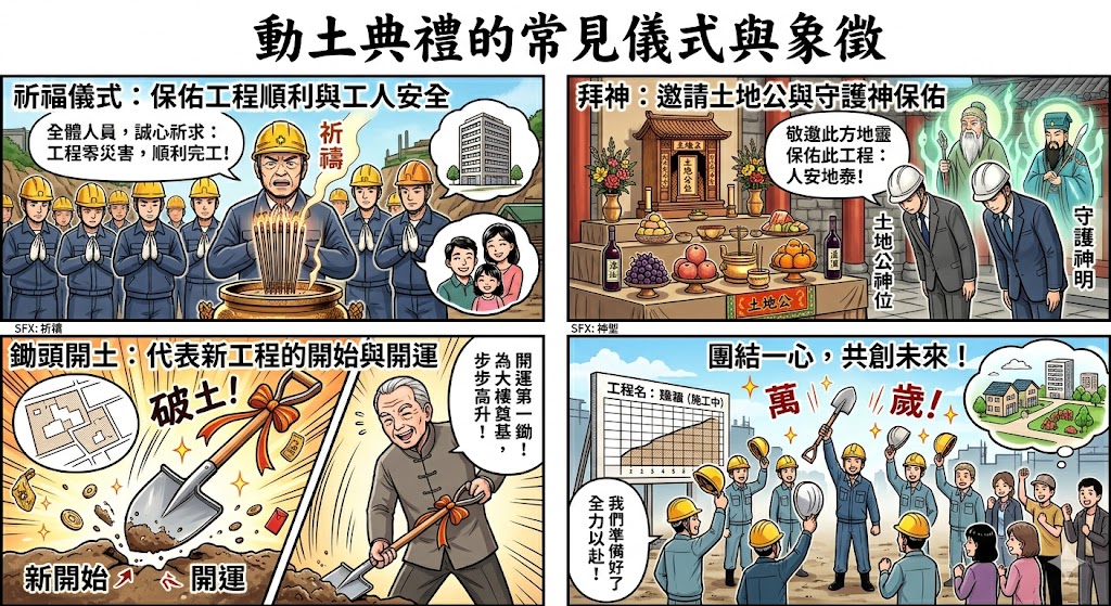 A:動土典禮的流程通常包括選擇吉日、準備祭品、儀式上的拜神、鋤頭開土等環節,並藉此啟動工程,象徵著工程的正式開始。